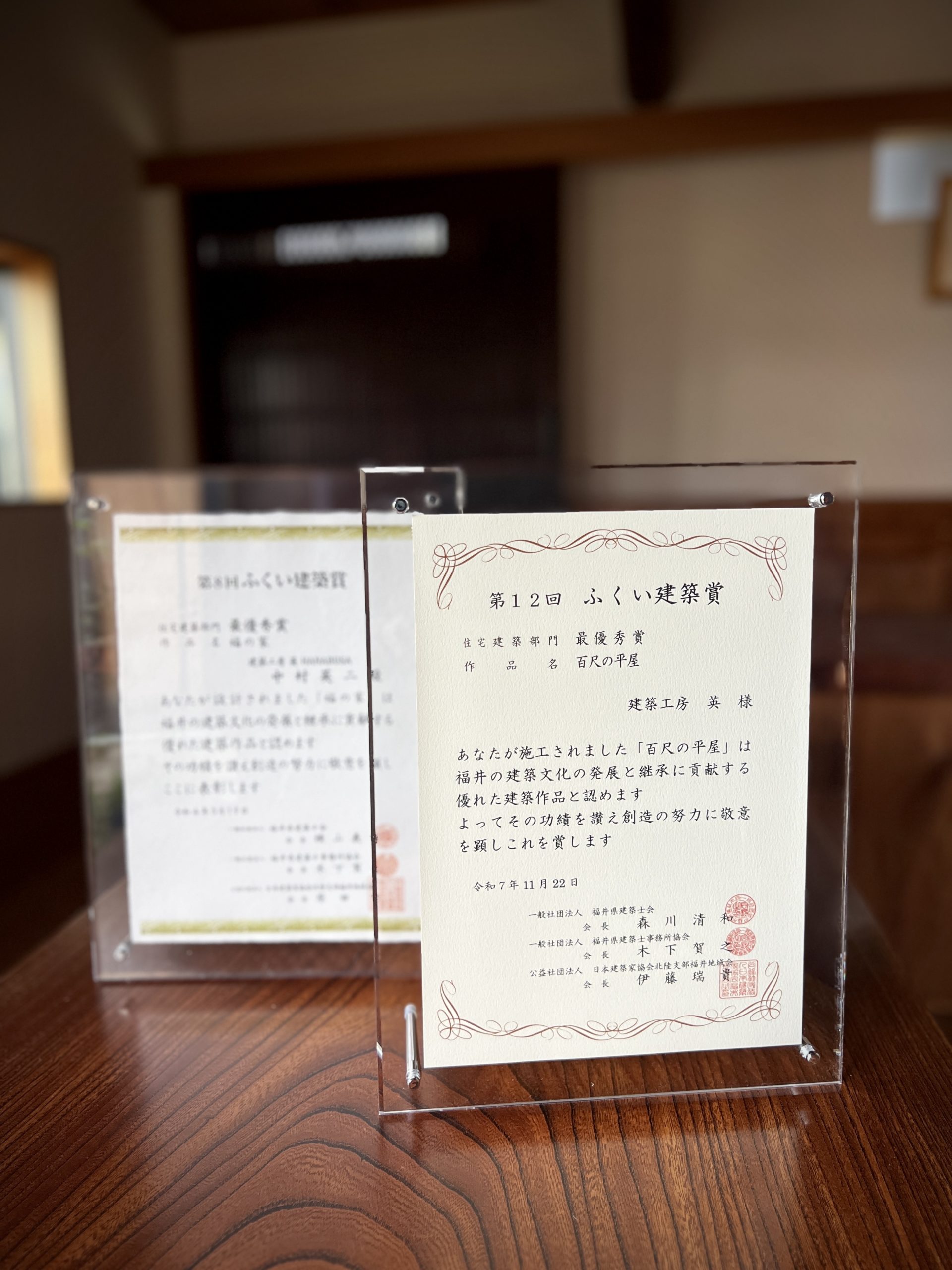 四年前にも同賞をいただいきましたが、今回は施工で頂戴しました。(設計:野路建築設計事務所)